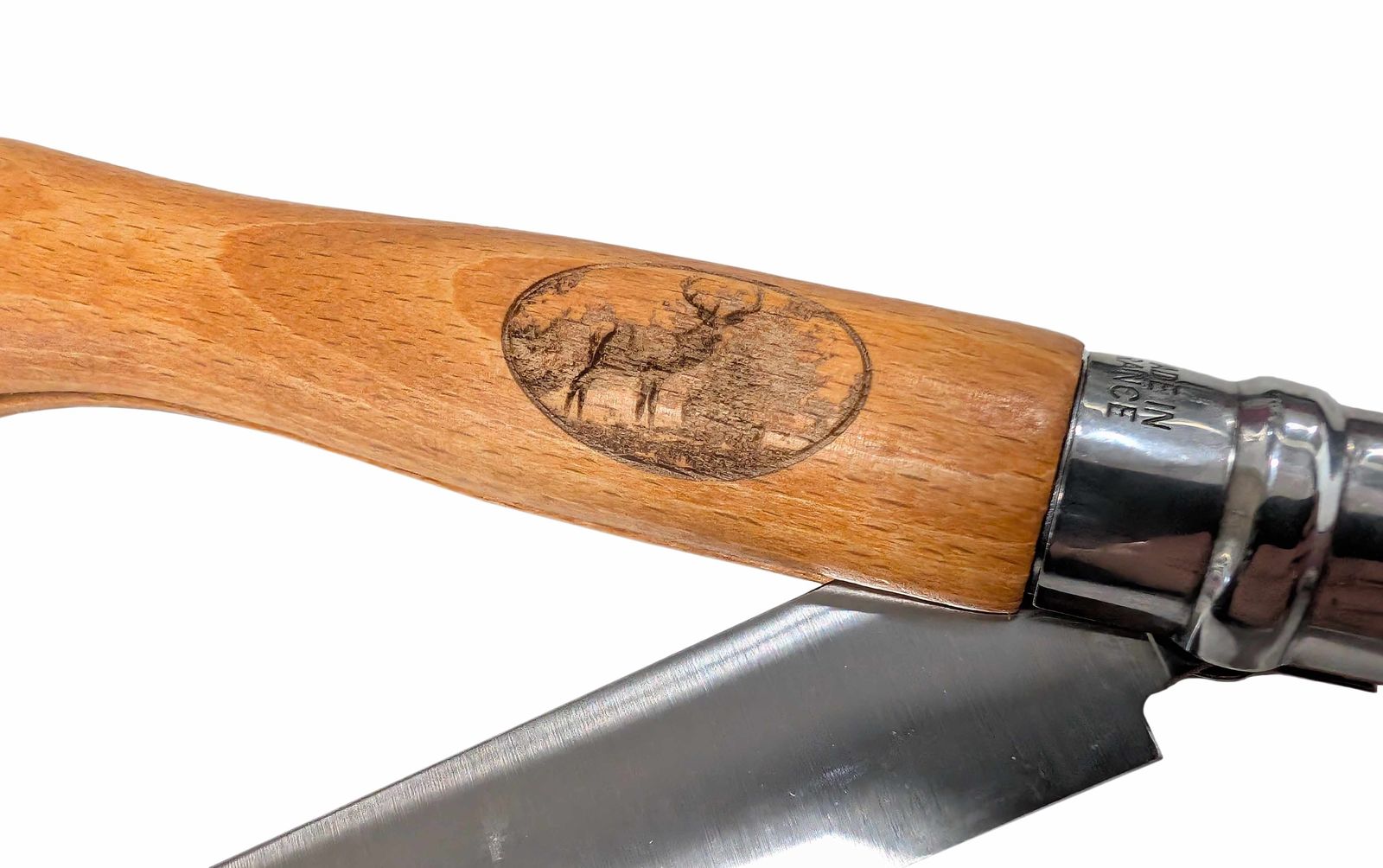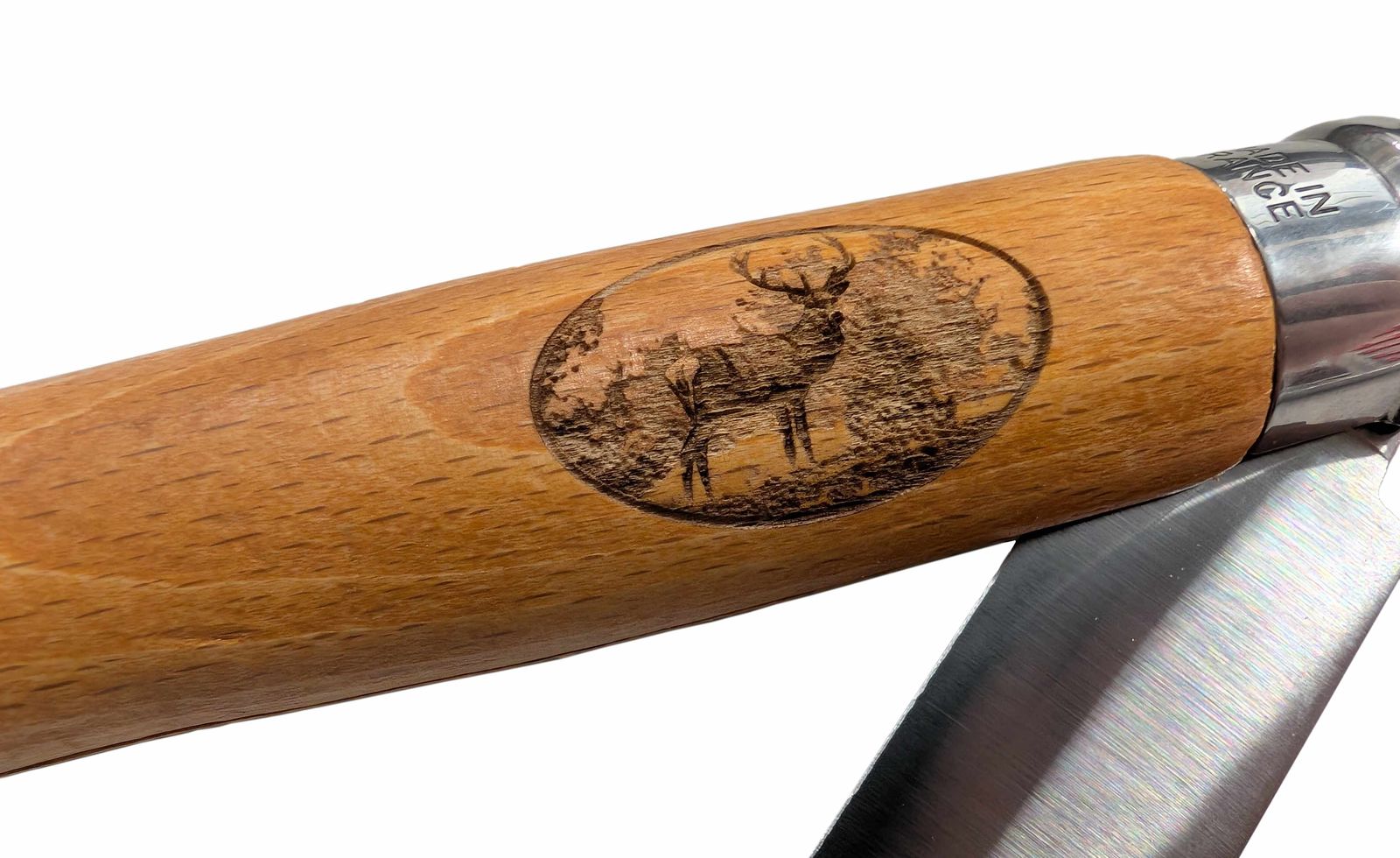 Individuelle Gravur auf dem Opinel Messer, Größe 12, Carbonstahl mit Hirschgravur Individuell by MTM: