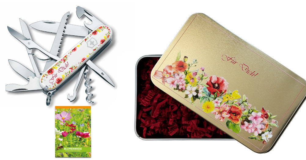 Eine süße Geschenkdose mit einem Blumendruck. Die Dose beinhaltet ein Messer mit Blumenmotiv und Blumensaat.